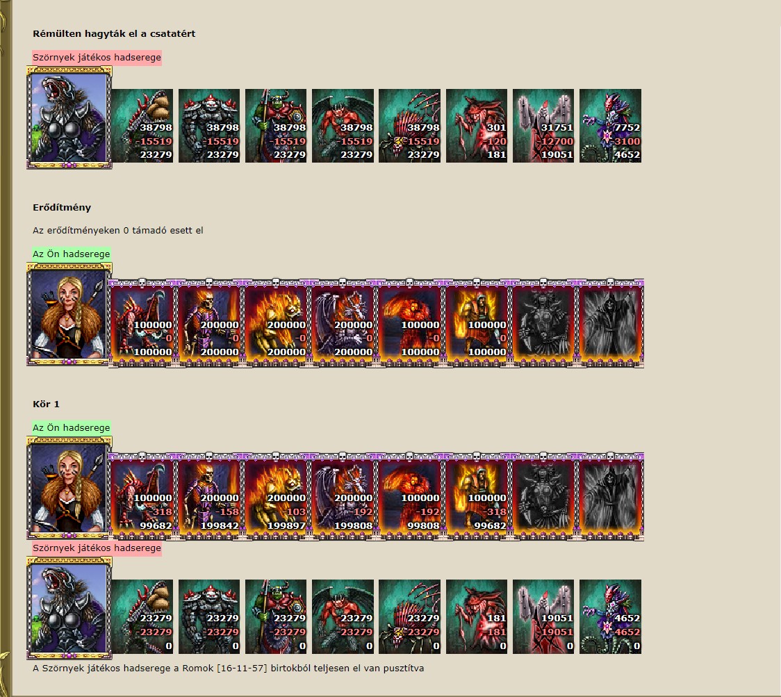 Egy mozgalmas nap végén, amikor már csendesülni látszott a várnép még egy utolsó küldetésre szólítottam fel a birodalmam összes kutatóját. Éjszakai járatra kell menniük, mert szörnyű veszély közeledtét érezték udvari tanácsadóim. Másnap virradóra hatalmas robajra ébredtem! Az egyik kutatómesterem azonnal látni akar és személyesen szeretné a hírt közölni, amely szerint a tanácsadóim megérzése valósággá vált és mindössze 1 királyságra szörnyek hatalmas seregét vélte felfedezni egy hatalmas 7-es szintű romban. -Fenséges uram, egy rettenetes szörnysereg szállta meg a szomszédos királyságok egyikét, várában egy vérszomjas szörnyhőssel! Uram, sosem láttam ilyet, azonnal cselekednünk kell! - mondta. Az előző napi folyamatos csatázás utáni jól megérdemelt borozás hatása alatt álltam, ezért nem hittem neki. Majd hűséges kutatóm kezembe nyomta a messzelátóját és magam is megcsodálhattam a hihetetlen dolgot, amire hosszú évek óta vártam. 7-es rom tekintélyes mennyiségű fekete igazgyönggyel a kincstárában. Végre! Az éveken át féken tartott seregem hadba indulhat legyőzni a rettentő szörnysereget. Tanácsadóim azonnal elküldték az udvari kémeket, hogy felmérjék a veszély nagyságát, akik némi aggodalommal közölték velem a hírt, miszerint a hős is otthon van erősen felfegyverkezve ereklyékkel és nem utolsó sorban egy regiment sereggel. Itt a nagy esély, nem vesztegethetjük az időt! Felharsant az udvari kürt. Gyülekező, készenlétbe!!! Jósaimat, haditanácsot és a hősömet azonnal magamhoz hívattam egy gyors tárgyalásra és felkészítettem az összecsapásra. Gyorsan kell cselekedni, mert idegen seregek kutatómesterei is úton lehetnek ez idő tájt. A jósaim tanácsát megfogadva hősöm még egy-két fondorlatos varázslattal megerősítette az egyébként is magabiztos és határozott seregemet, ezzel még jobban felülkerekedhet a vérszomjas lények felett amik nyálukat csorgatva vártak bennünket a rom falai mögött. Katonáim türelmetlenül várták a parancsomat, már nagyon ki voltak éhezve egy nagyobb összecsapásra és tudták, ha sikerrel járnak, nem marad el gazdag jutalmuk. Mindössze 15 perc alatt elérték a csatateret, közben látnokaimtól folyamatos jelentést kértem, hogy megnyugtassam magam és várnépemet, hogy nincs más hadvezér úton, beelőzve engem. A csata hatalmas robajjal megkezdődött és csapataim elsöprő győzelmet arattak a szörnyek rettegett serege felett mindössze 1 kör után, majd óriási zsákmánnyal tértek vissza a csatából. Végre ismét magamhoz hívhatom a kereskedőt, hogy hősömnek új fegyvereket vásárolhassak, erősítve a jövőbeni véres összecsapásokra. Aznap mindenki ünnepelt erősen felöntöttünk a garatra, miközben a jól megérdemelt jutalmukat egyenlően szétosztottam hős katonáim közt, akik még aznap este eltervezték, hogy mit tesznek a sok-sok arannyal.
